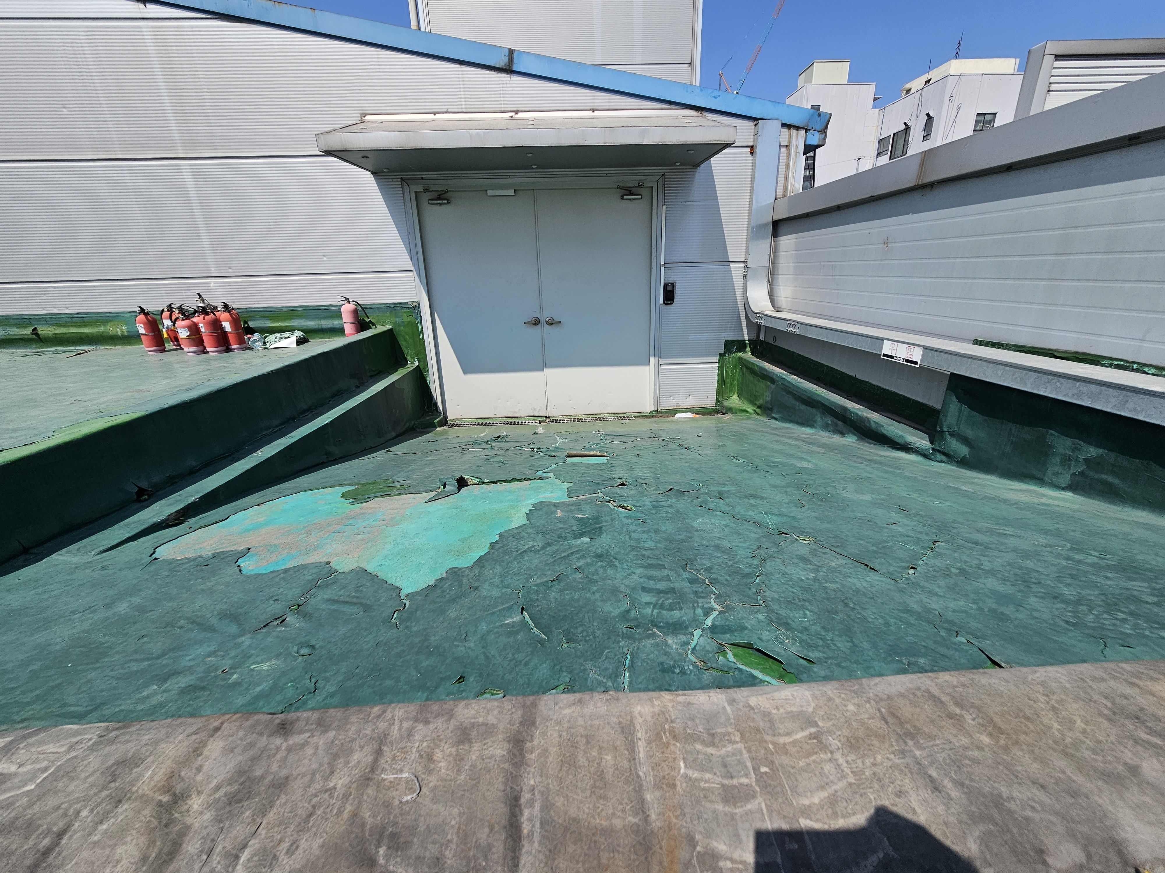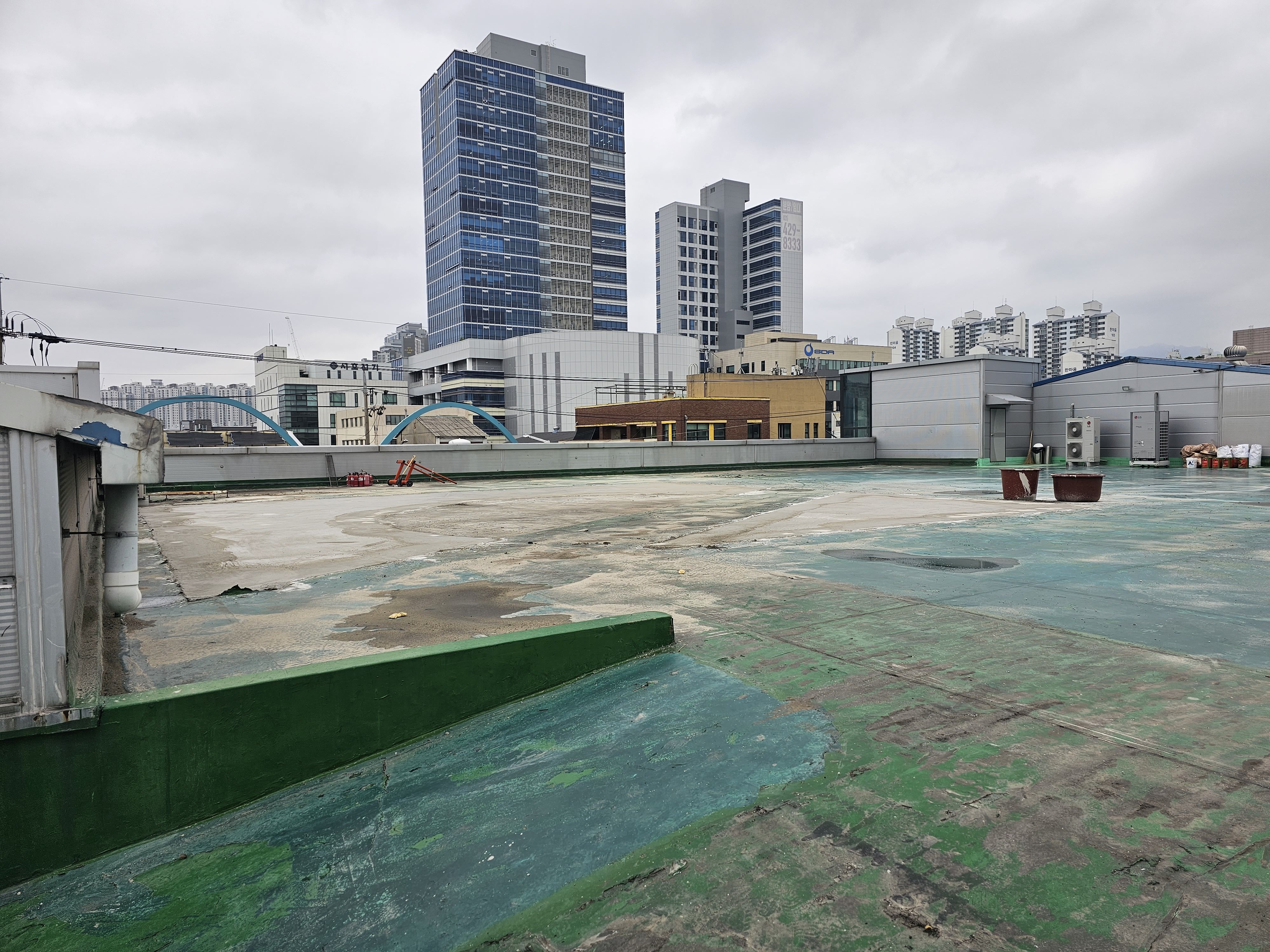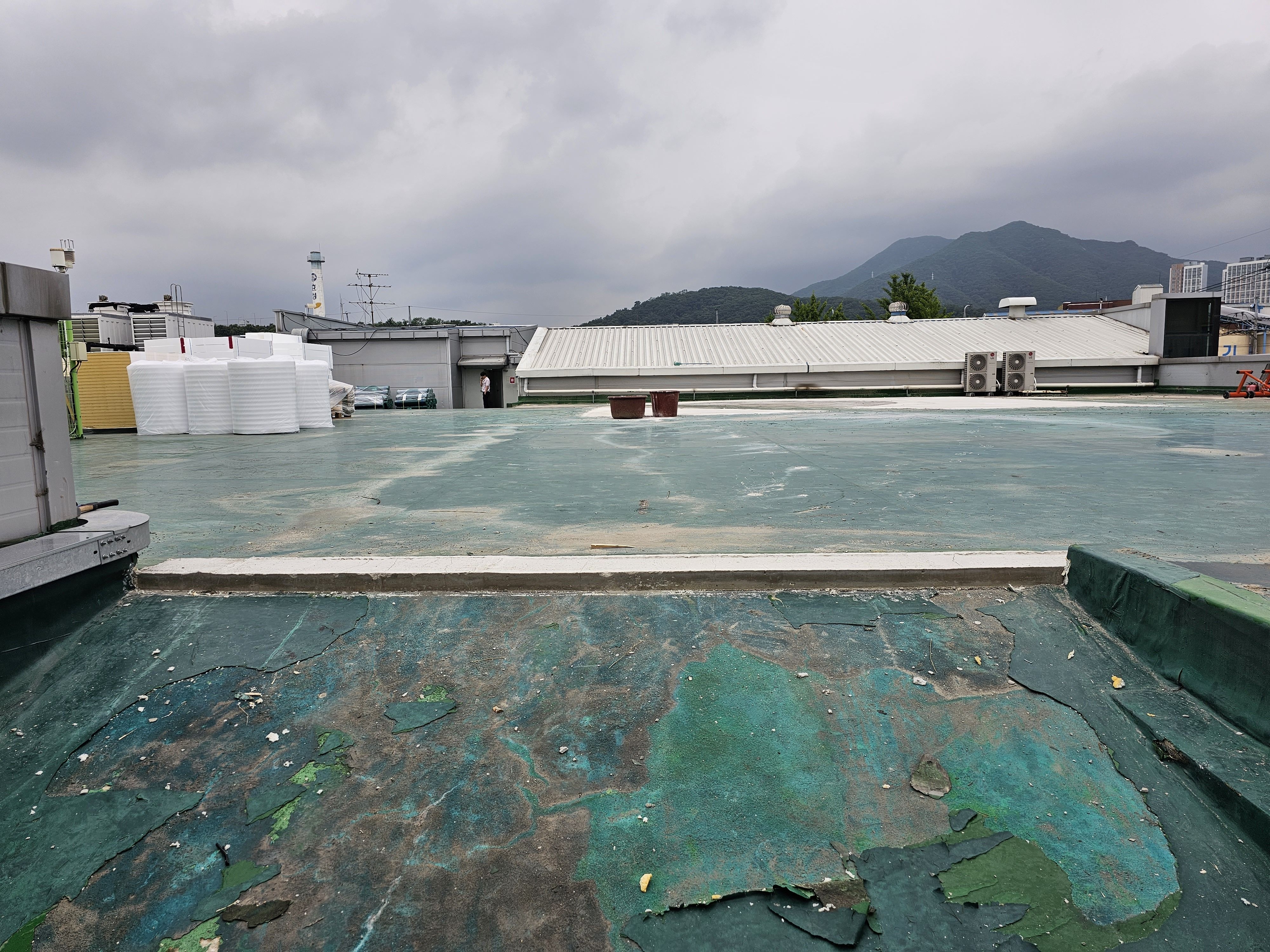 원 인 : 화단으로부터 발생된 주원인의 누수와 기존 우레탄 노후화, 판넬지붕 실리콘 보수로 모든 구간 방수 성능 품질 저하
