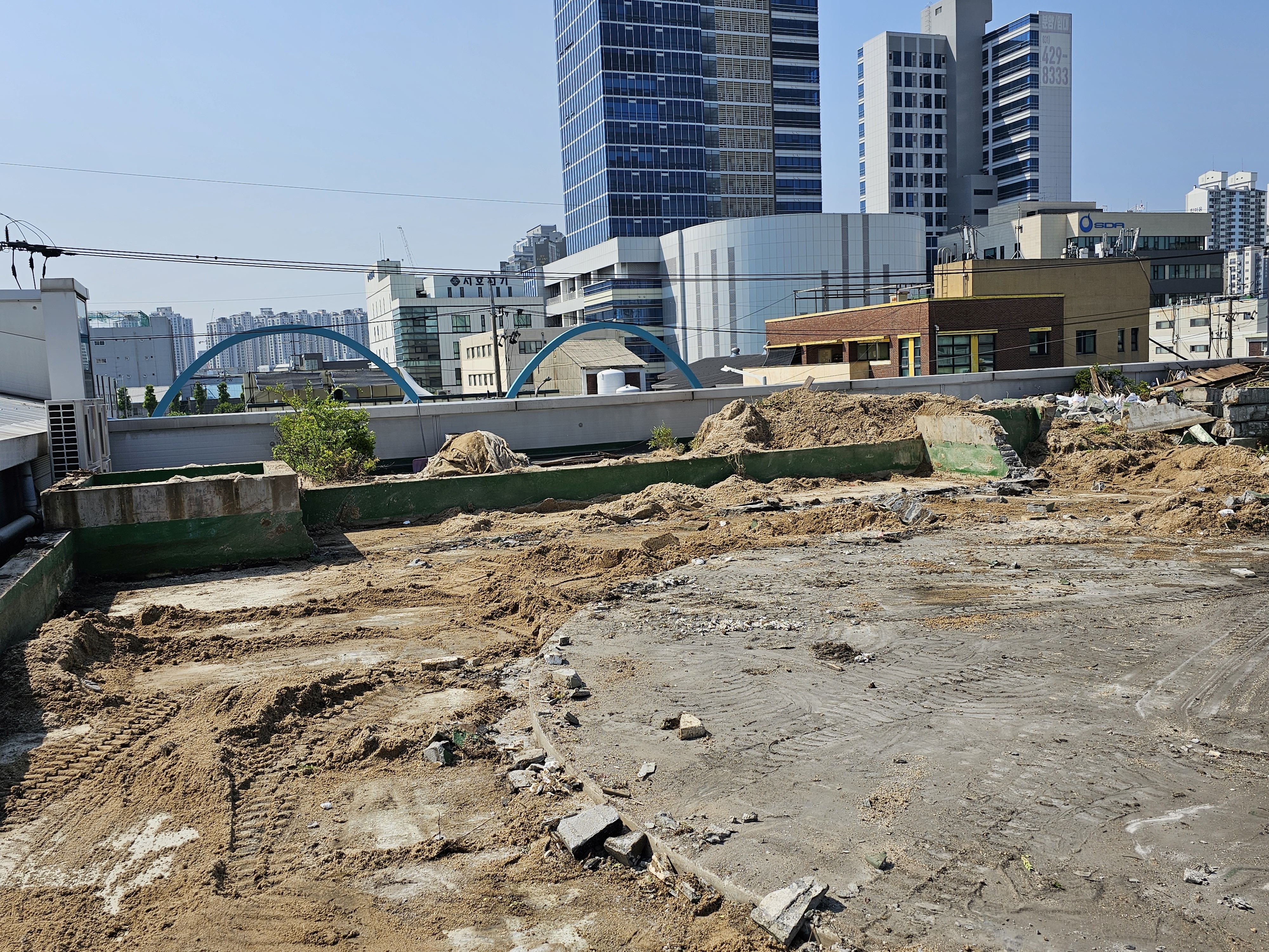 공 정 : 화단, 기존 부식된 나무데크 철거 > 화단자리 비노출우레탄 > 화단자리 몰탈 타설 > 경사구간 출입구 콘크리트 방수턱 설치 > TPO 방수공사 본 작업 진행